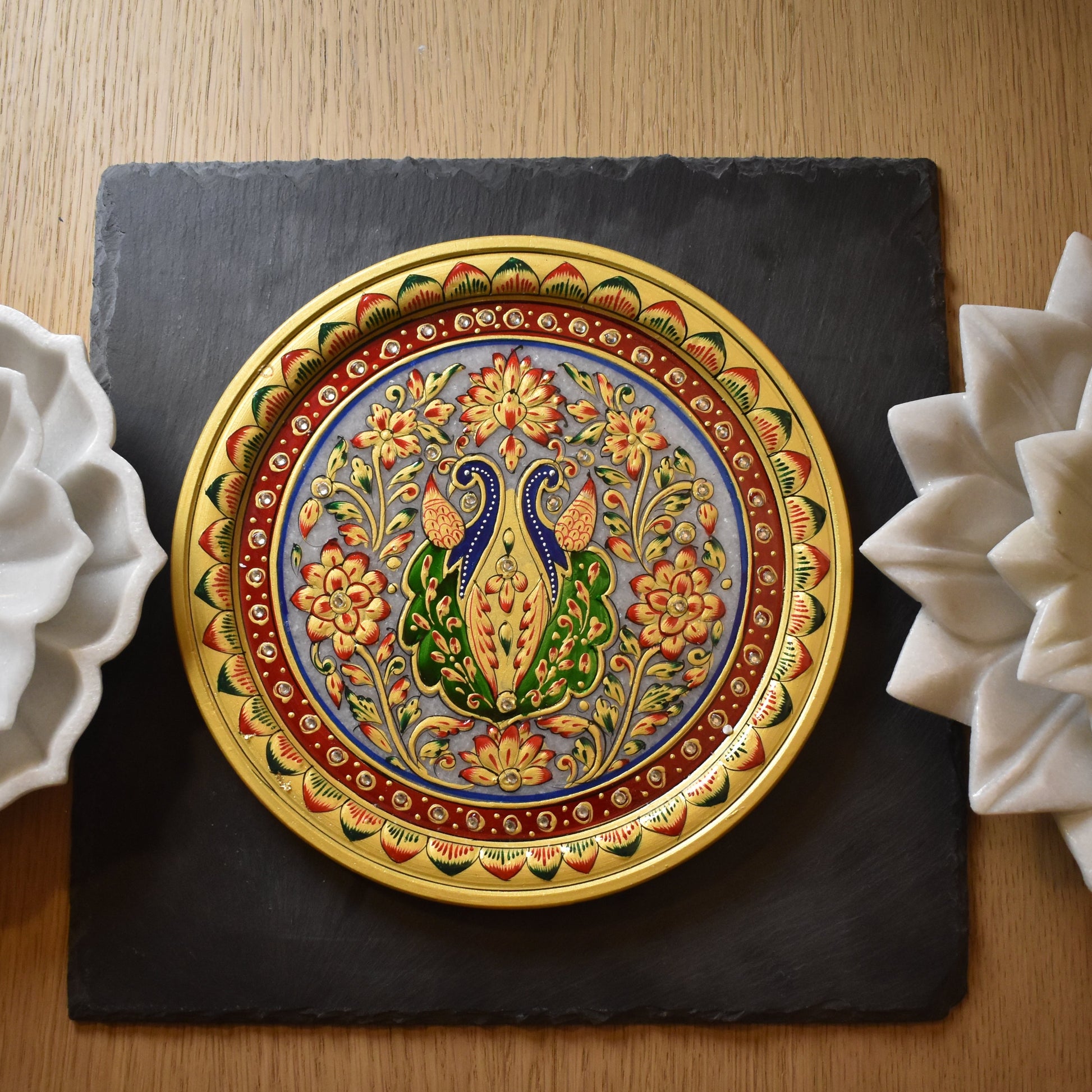 A masterpiece of Indian artistry, this hand-painted marble plate captures the beauty of heritage in every detail. Set against a smooth marble base, the vibrant design features twin peacocks surrounded by intricate floral patterns, all hand-painted with rich hues of red, green, gold, and blue.