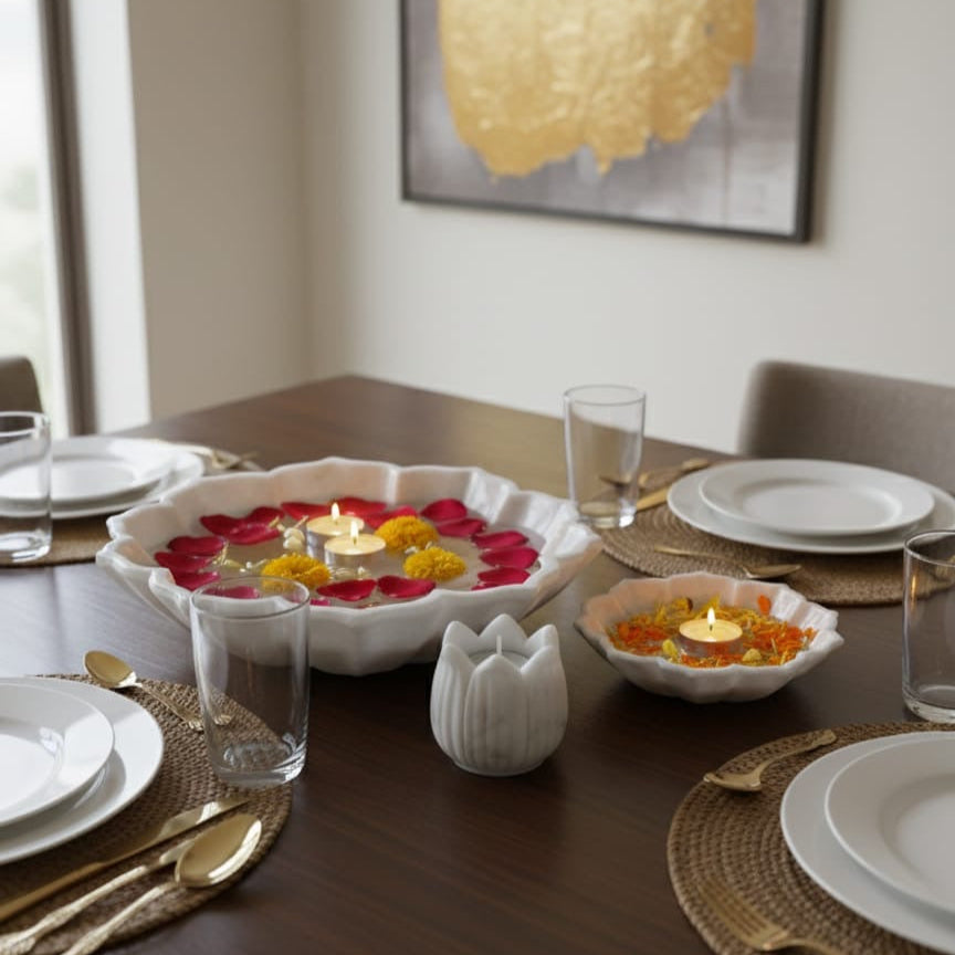 Inspired by timeless Indian traditions, this Marble Urli is a beautiful blend of heritage and elegance. Hand-carved from natural white marble, its lotus-inspired form makes it a stunning centrepiece for your home.